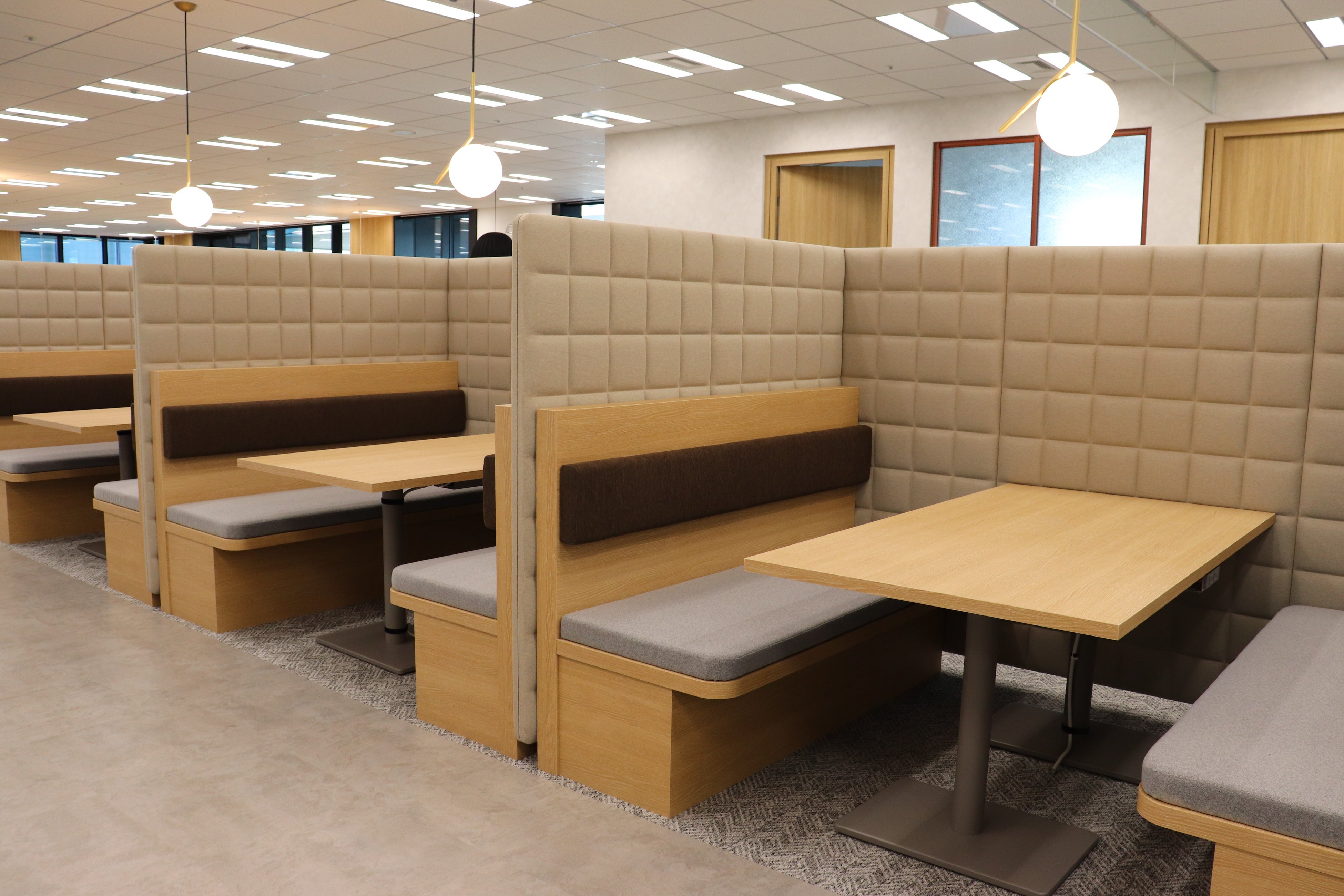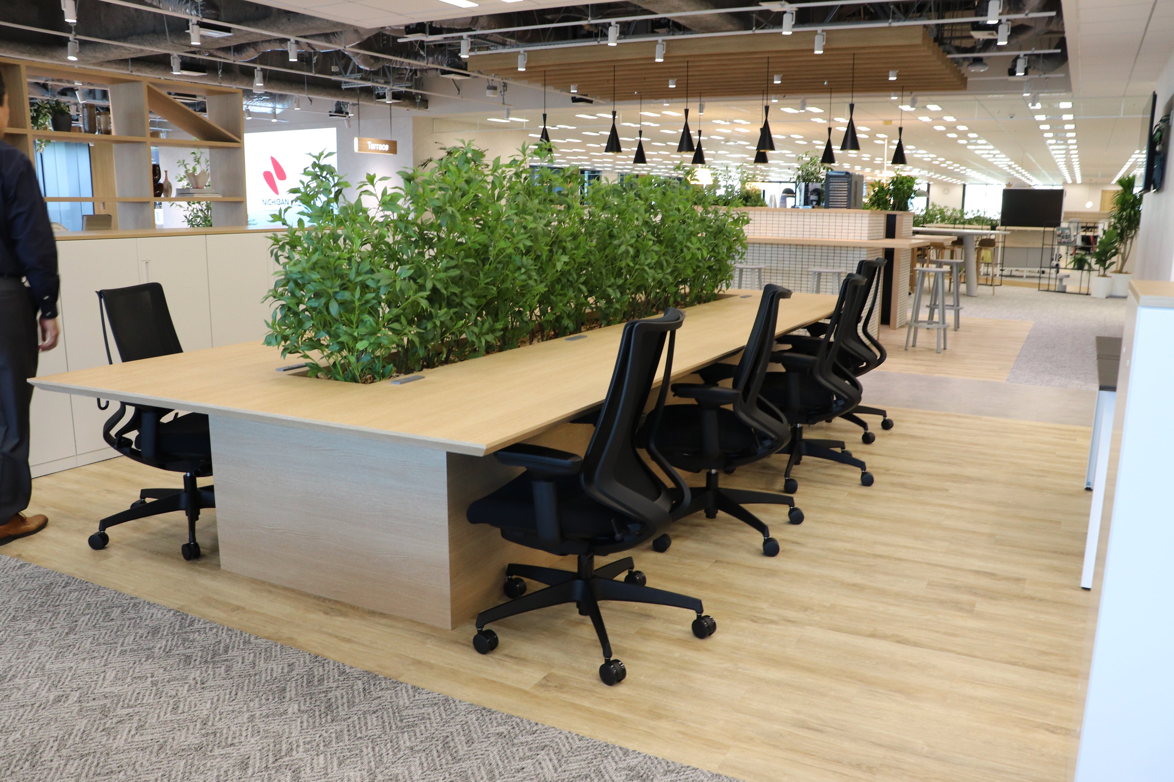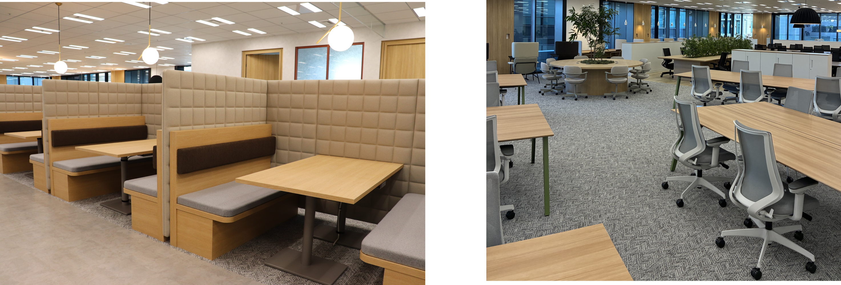 【Social Terraceとは】 「Social/社交的な Terrace/室内と外とをつなぐエリア」であり、「繋がる力を強めるオフィス」というコンセプトを体現しています。 自分の家(部署)から外に出て、テラス(=大小のラウンジ)を通じて隣同士や外部、未来へとつながっていく新たなオフィスの在り方を目指します。 壁がなく、自立した人々が気持ちよく繋がる場所となることで、部署を超えたコミュニケーションを促進します。