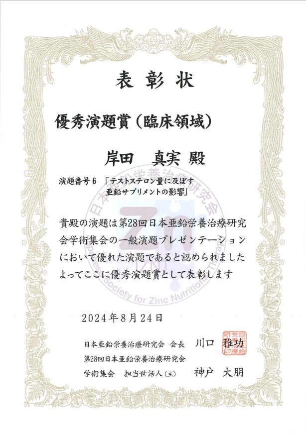 吸収型亜鉛の摂取による男性ホルモン増加に関する研究が日本亜鉛栄養治療研究会「優秀演題賞」を受賞