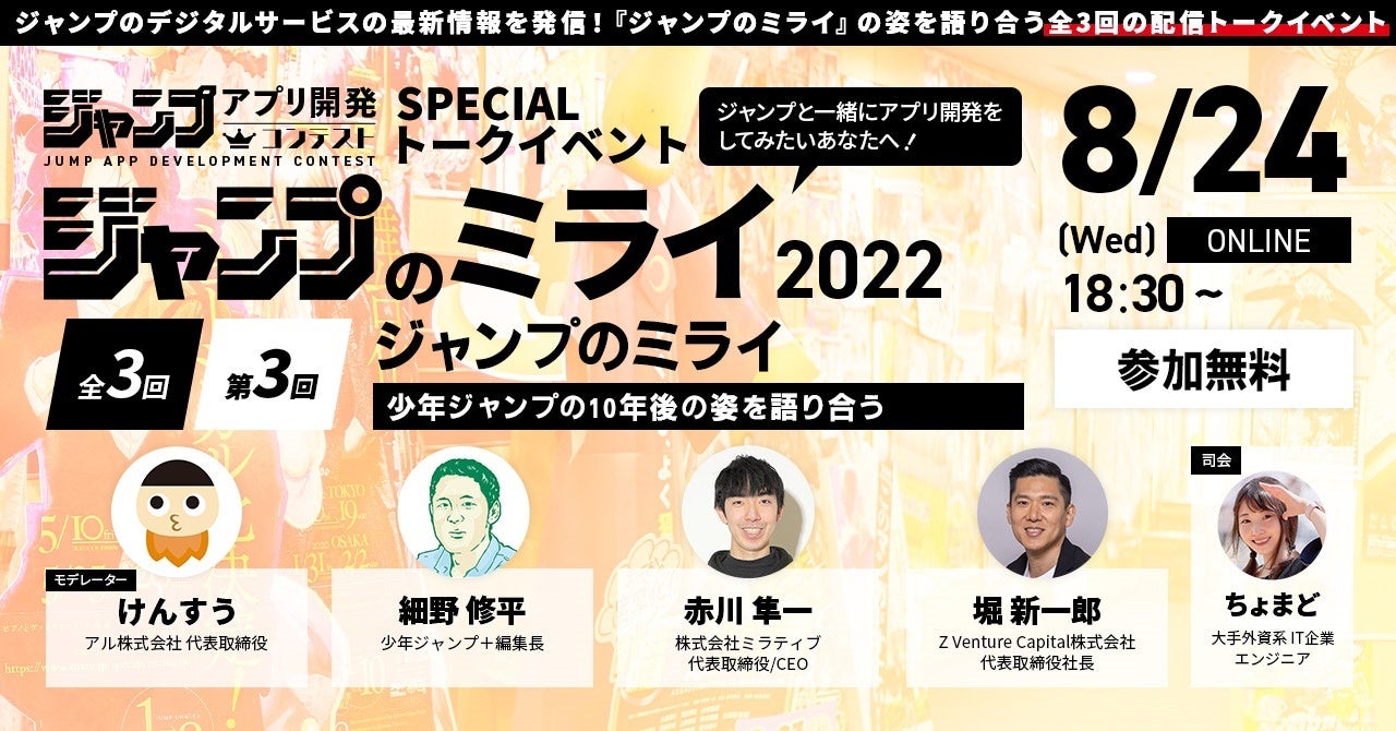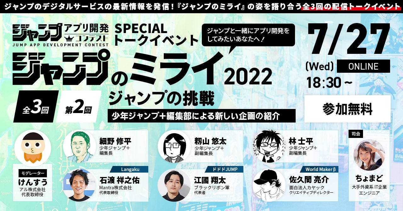 少年ジャンプ+編集部が運営するデジタルサービスの最新情報やこれからの展望について語るオンライントークイベント「ジャンプのミライ2022」を6月から3か月間、月に一度実施予定です。本イベントは、募集中の「ジャンプアプリ開発コンテスト2022」の関連イベントとしてWEBサービス開発者などを対象に全3回で実施しているオンライントークイベントです。