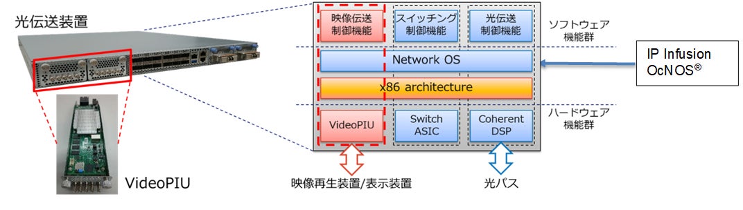 本技術の長距離伝送のディスアグリゲーション構成(図1参照)では、光伝送装置上に、SDI信号をSMPTE ST 2110形式に変換するプラグインユニット(VideoPIU)とVideoPIUを制御する機能を提供するソフトウェアを組み合わせることによって実現しています。VideoPIUは1枚当たり8K60p映像の処理が可能で、2枚を連携して動作させることで8K120p伝送を実現しており、IP Infusionは、このVideoPIUをサポートするネットワークOSとして「OcNOS」を提供しました。