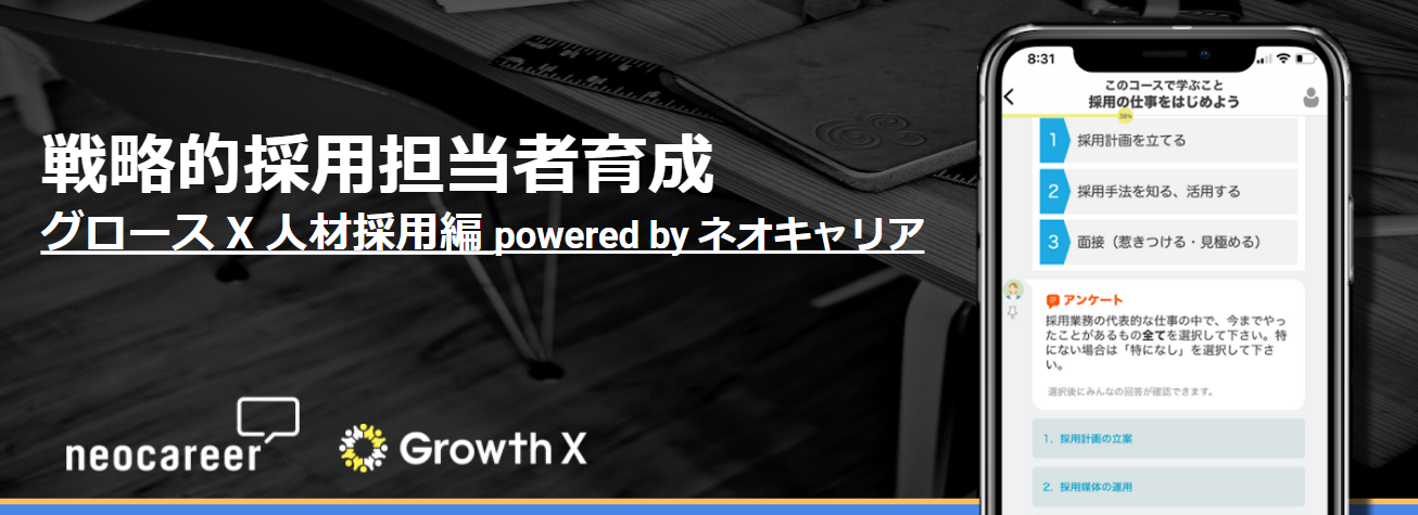 株式会社ネオキャリア(本社:東京都新宿区 代表取締役:西澤亮一、以下 ネオキャリア)は、この度、デジタル人材育成の学習アプリを運営する株式会社グロース X (本社:東京都渋谷区 代表取締役社長:津下本耕太郎、以下 グロース X)とEdTech分野(※)で協業し、戦略的採用担当者育成を実現する学習アプリ「グロース X 人材採用編 powered by ネオキャリア」を共同開発、販売を開始します。