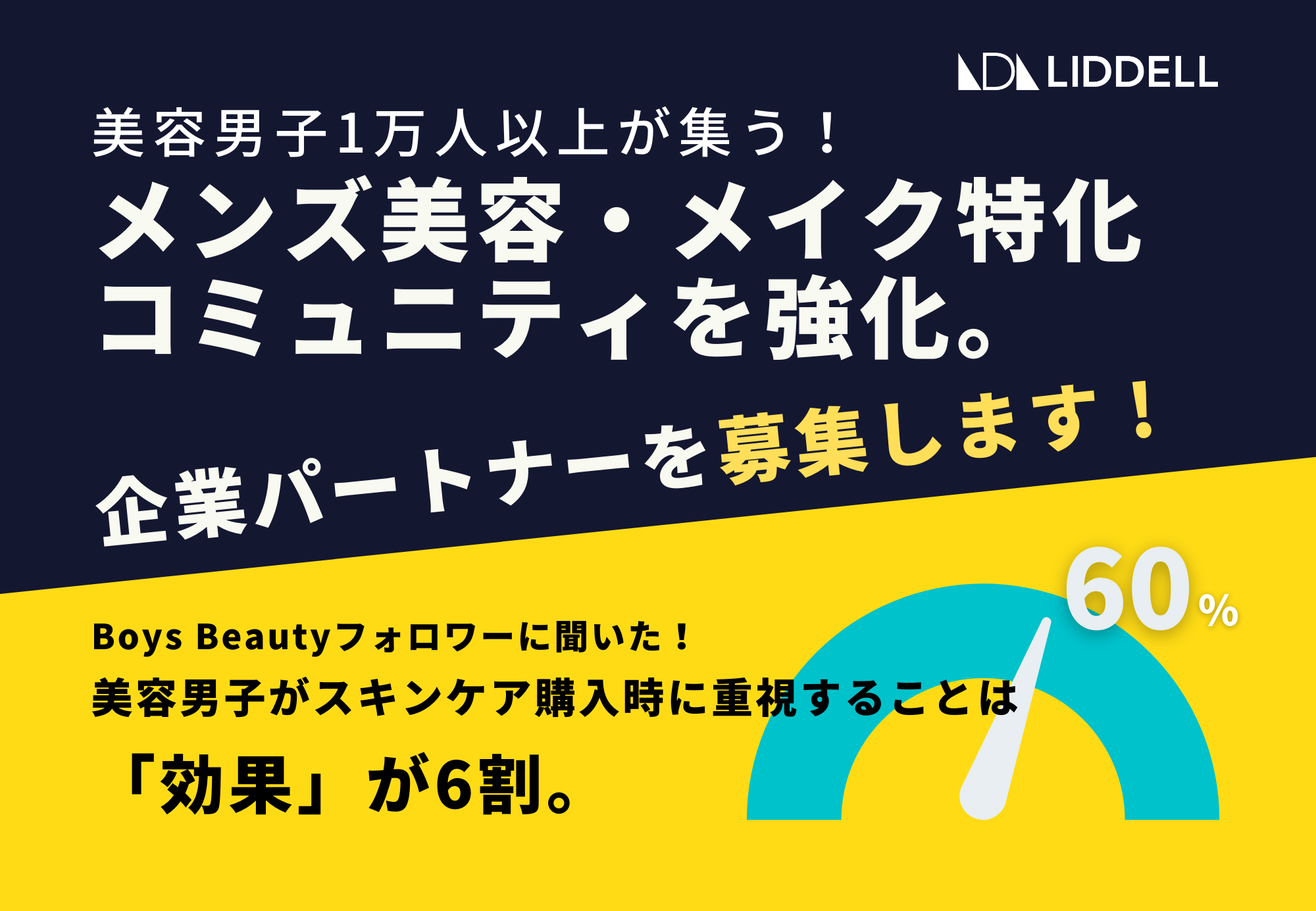インフルエンサーマーケティング事業を展開するLIDDELL株式会社 (本社:東京都港区、代表取締役:福田 晃一、以下リデル) は、運営するメンズ美容・メイクに特化した国内最大級のオウンドコミュニティ「Boys Beauty(@boysbeauty_jp、https://www.instagram.com/boysbeauty_jp/)」の運営を強化し、新規・既存顧客の拡大を検討する企業パートナーの募集を開始しました。