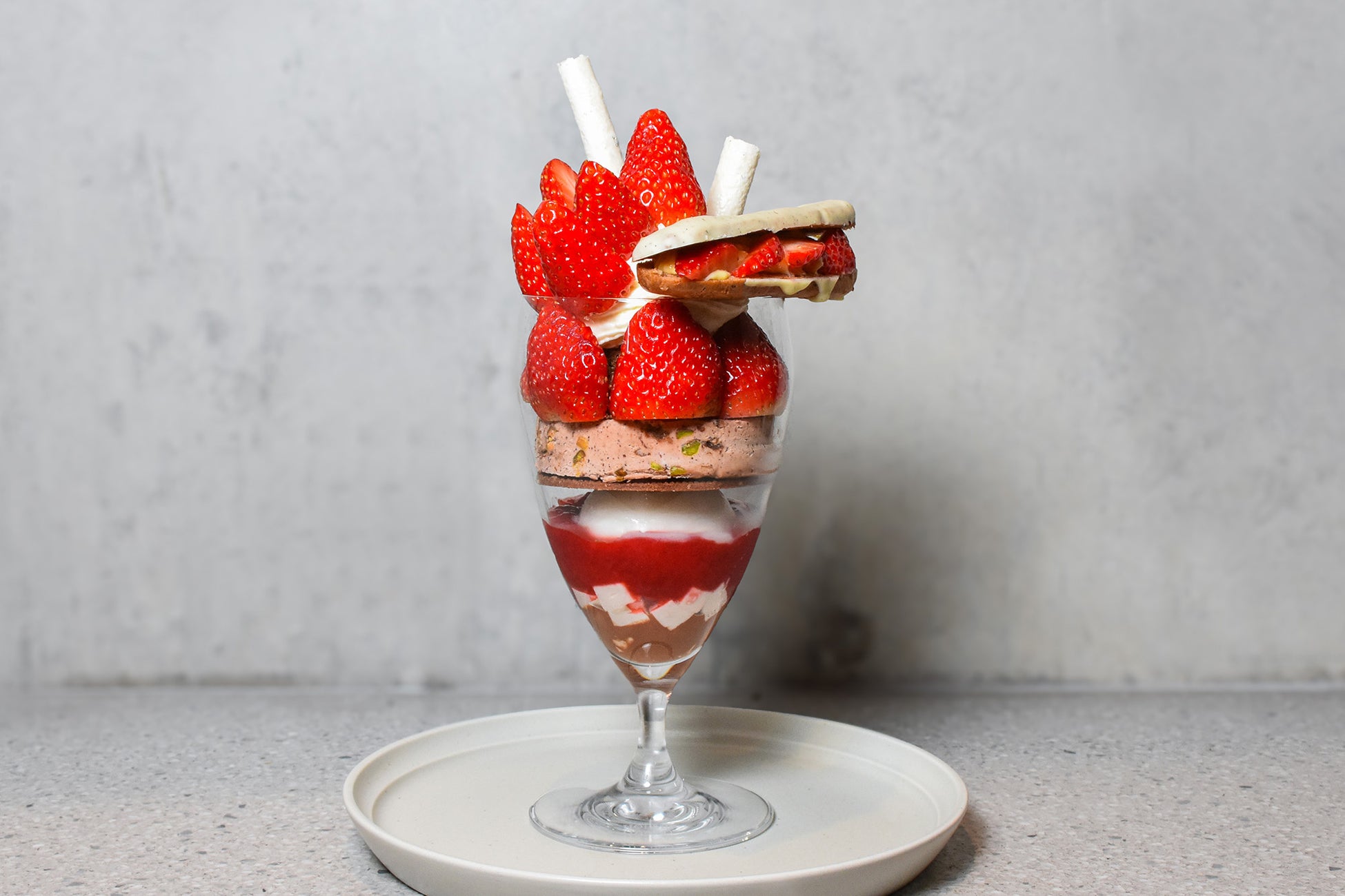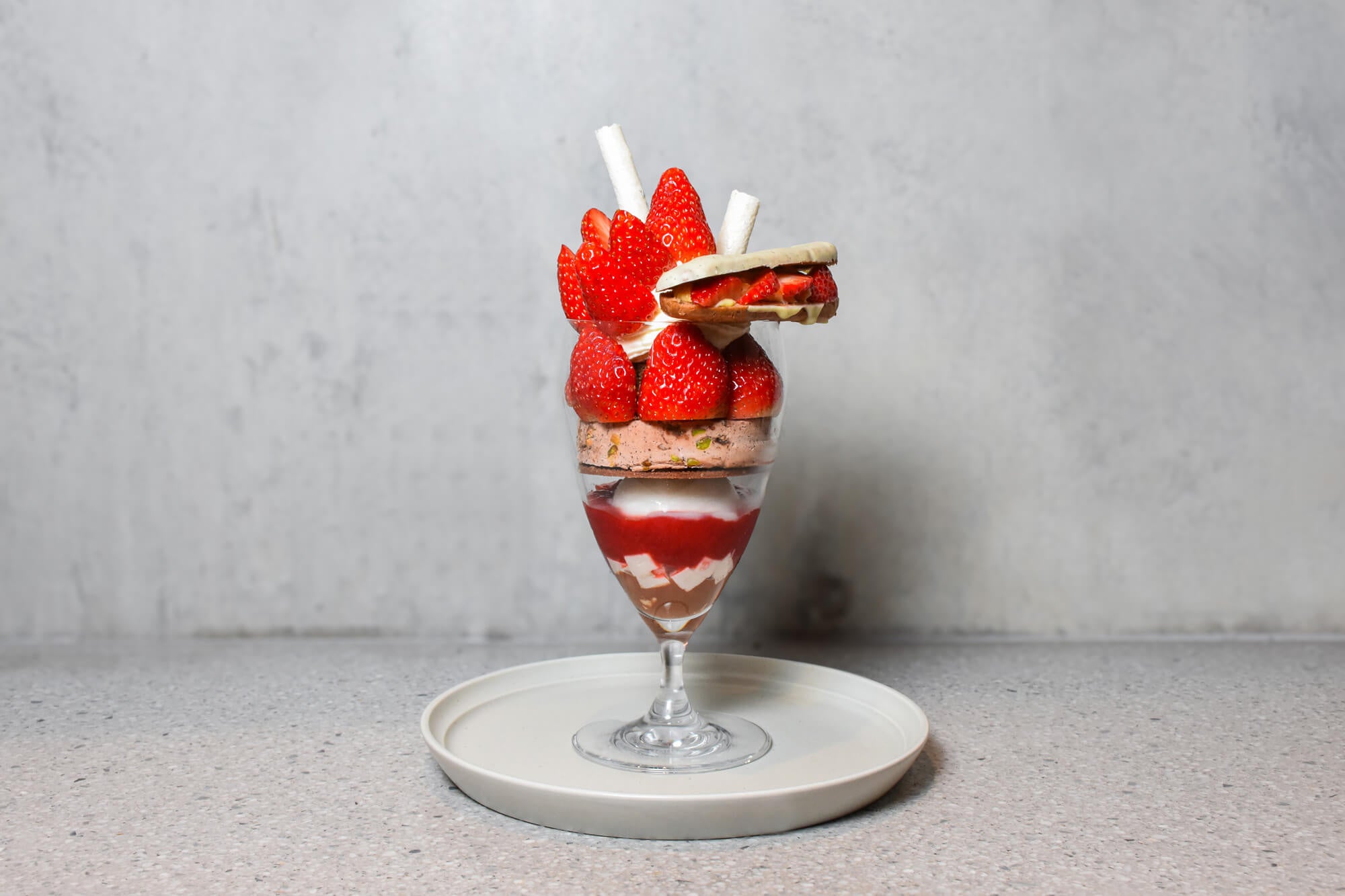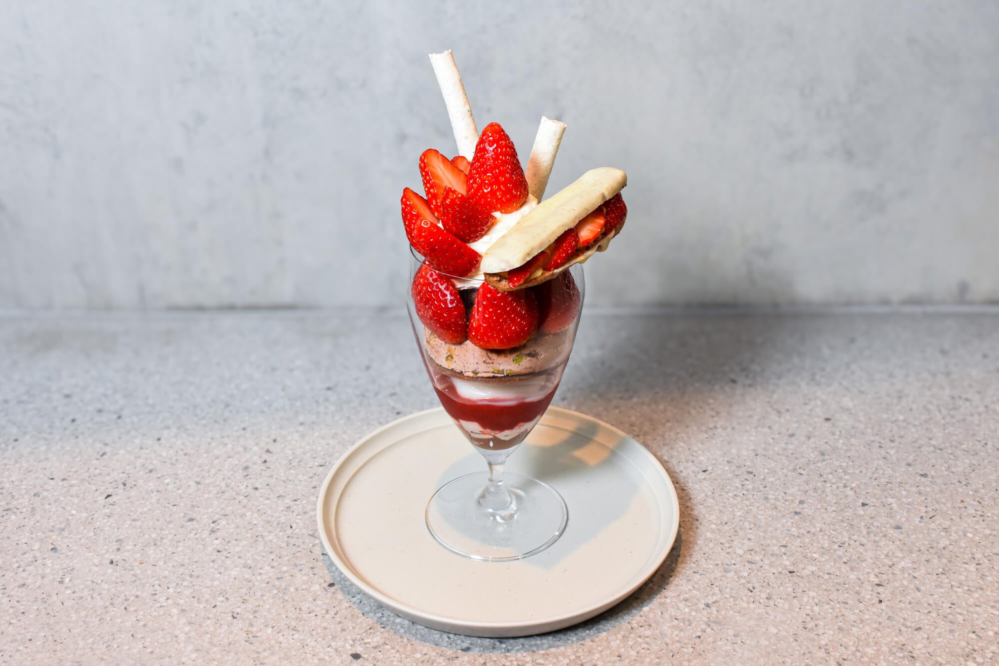 Minimalより、冬限定の苺パフェが登場。パティシエが目の前で仕上げる、ライブ感あふれるカウンターデセール。旬の甘酸っぱい苺とチョコレートを存分に味わえる冬パフェ