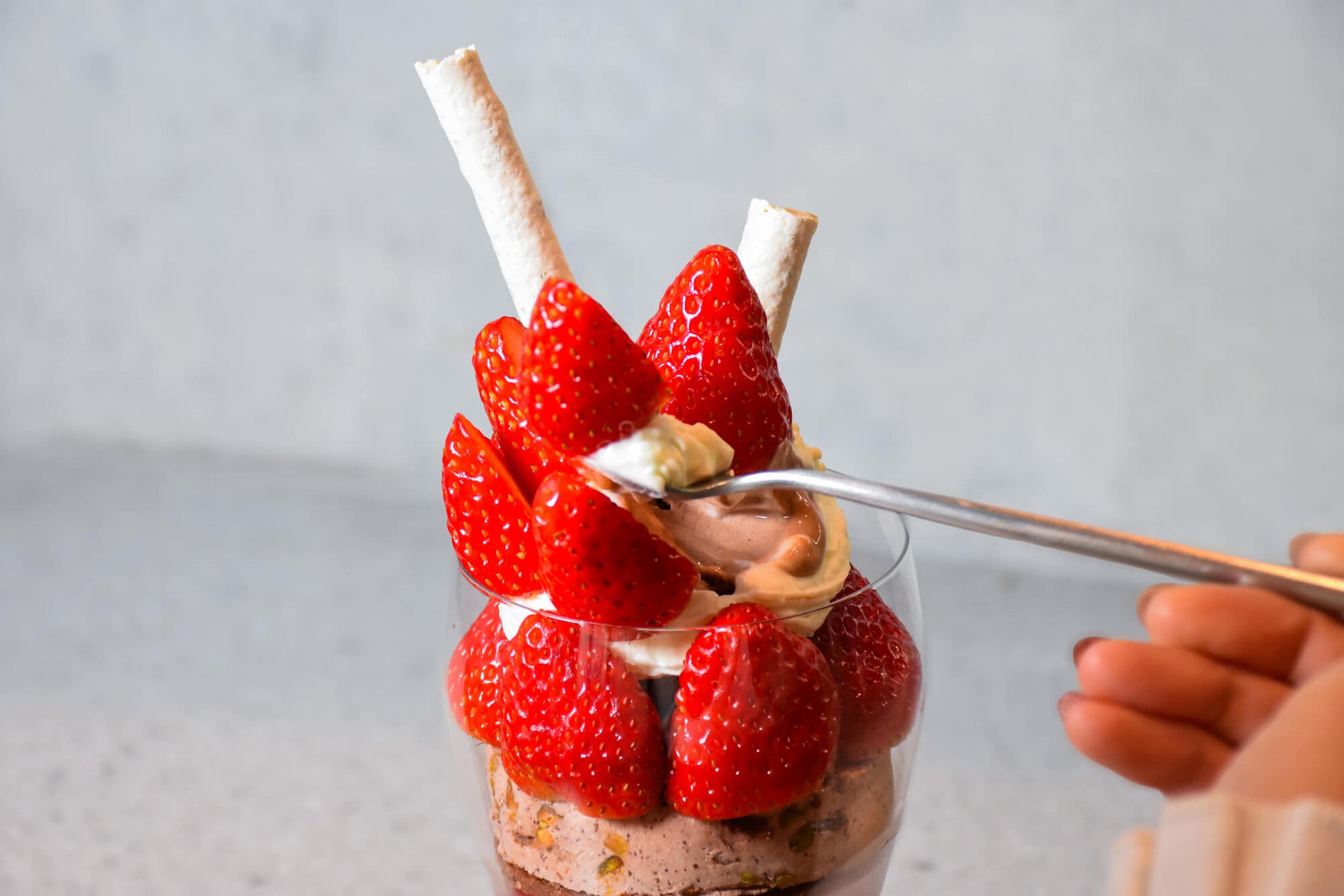 トップに盛り付けた苺の下には、苺の甘酸っぱさに寄り添う、カカオ由来のベリーのような果実味を感じるマダガスカル産カカオ豆を使ったチョコレートアイスが隠れています。苺の味わいを楽しんだら、チョコレートとの相性もぜひお楽しみください。