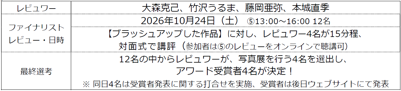 レビュワー(審査員):写真家 大森克己、竹沢うるま、藤岡亜弥、本城直季(五十音順・敬称略)