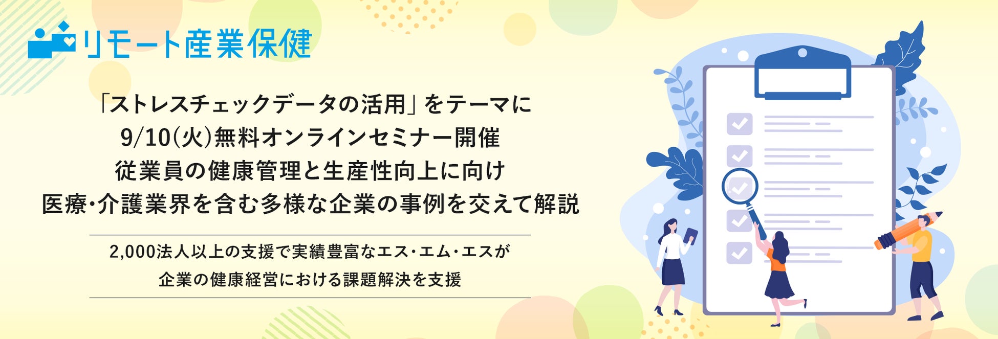 株式会社エス・エム・エス(本社:東京都港区、代表取締役社長:後藤夏樹、東証プライム、以下「当社」)は、「ストレスチェックデータの活用」をテーマに、企業の経営者・人事労務担当者向け無料オンラインセミナーを9月10日(火)に開催することをお知らせします。