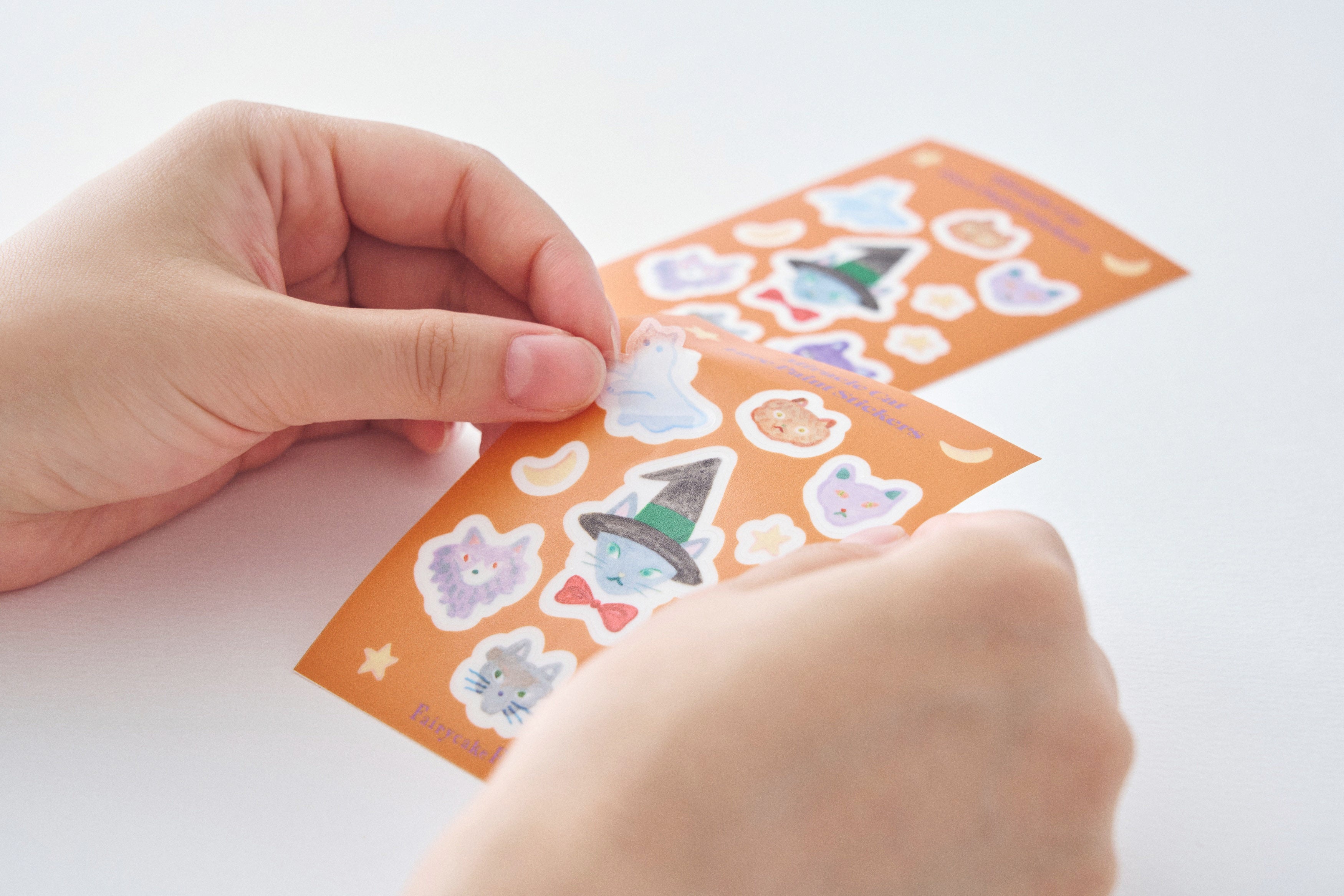 さらに、ハロウィンを盛り上げる「フェイスシール」とのセットも登場!前田ひさえさんの可愛いミラクルキャットたちを、手軽に顔や肌に貼れるデコレーションシールです。お子さまのハロウィン仮装やイベント時にもおすすめ。ペイントよりも気軽で、剥がすのも簡単!ハロウィンシーズンにぴったりの遊び心たっぷりのアイテムです。