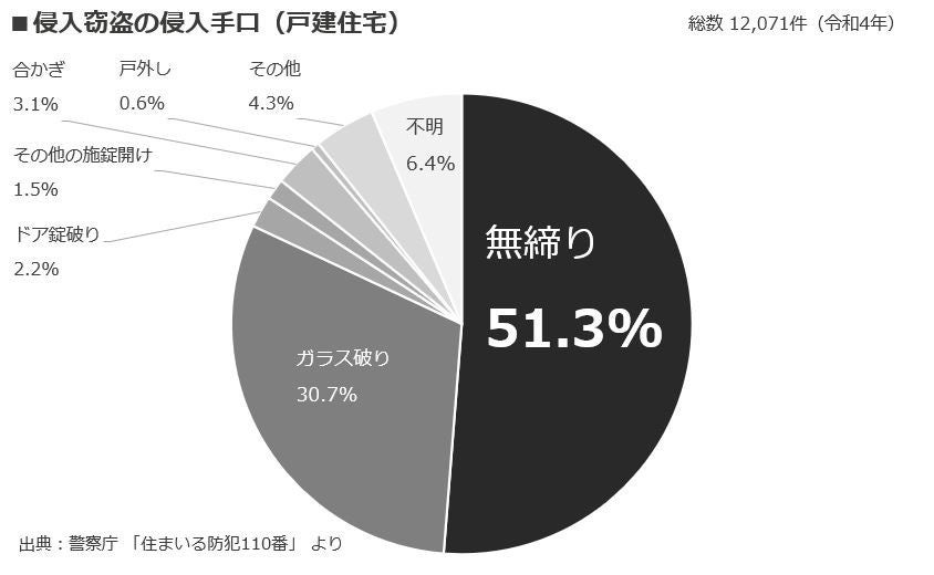 昨今、日本国内における住宅や店舗への強盗など、一連の事件を機に防犯対策への関心がより一層高まってきております。警察庁の統計によると、侵入窃盗の半分以上は無施錠のドアや窓から侵入されており(※1)、玄関ドアや窓の施錠をしっかりと行うことが防犯において重要になってきます。
