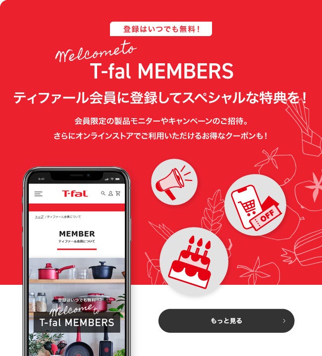 ティファールがもっと身近になる、毎日の暮らしを豊かにする会員限定のサービスです。 登録は無料で、会員限定の特典やお得な情報を受け取ることができます。この機会にぜひティファール会員にご登録ください。なお、オンラインストアでのご購入には会員登録が必要になります。