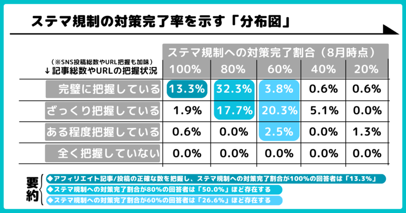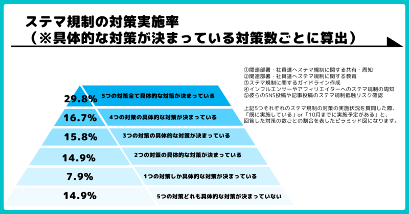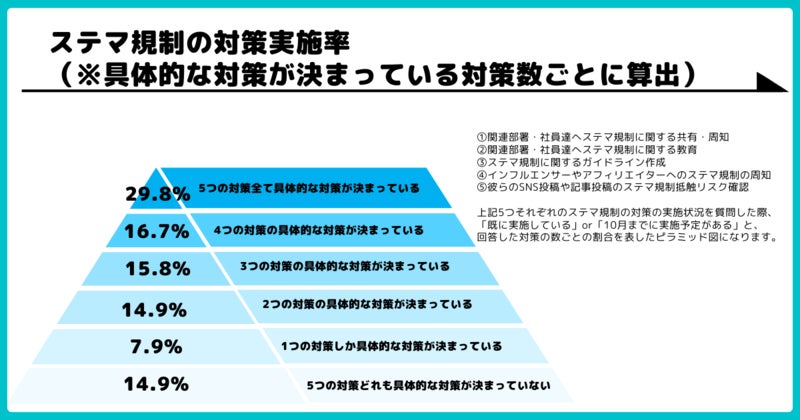 ・現時点で、ステマ規制に対する対策の目処が立っていない企業は他の企業と比べ大きく出遅れている状況である。