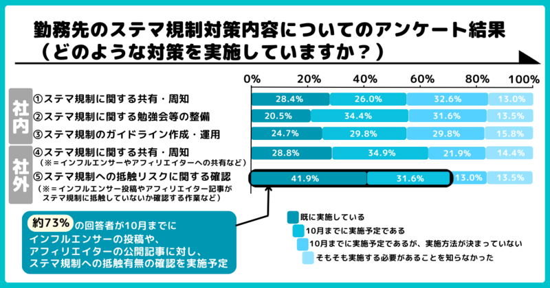 この結果から、ステマ規制の施行まで残り2ヶ月弱しかない状況(アンケート実施日は2023/8/1〜8/3)でステマ規制への対策が万全である企業が、未だ少ない状態であることがわかった。