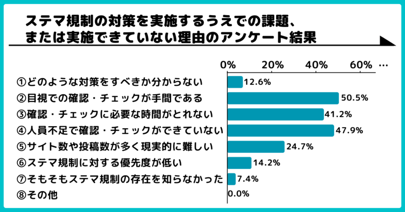 ・現状、対策を行っている企業も多くいるが、ステマ規制への対策をする際、「時間や人手などの工数不足」などの理由で完璧に対策を進めるのが難しい状況である。