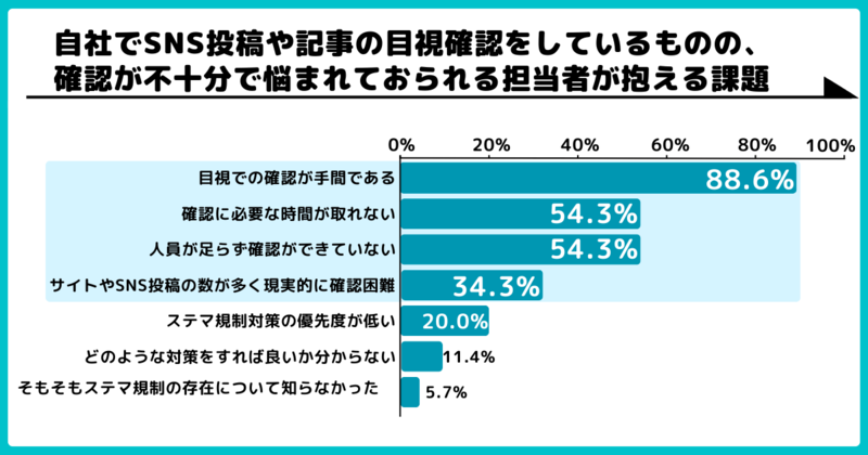 投稿や記事を確認・チェックをどのような方法で行っているのか質問して「自社の担当者が目視で確認を実施、または実施予定である」と答え、さらに、どのくらいの割合で投稿や記事の確認できているか質問して「全ての投稿や記事の確認ができていない」と回答した企業に絞って、ステマ規制の対策ができていない理由を質問した。その結果、88.6%の企業が目視での確認作業を手間だと思っていると回答した。