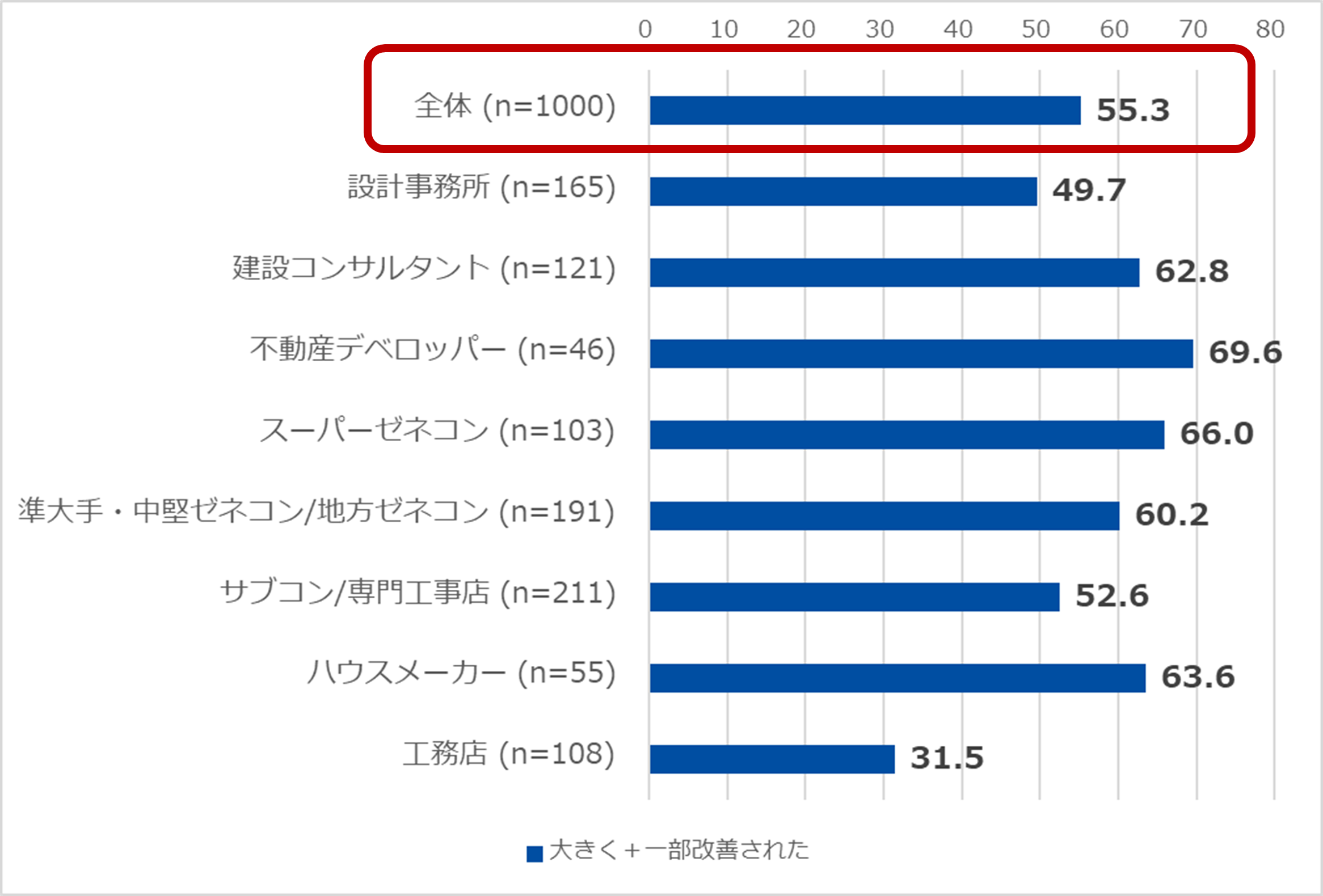 全体で55.3%が実感。内訳として「スーパーゼネコン(66.0%)」「準大手・中堅ゼネコン/地方ゼネコン(60.2%)」「サブコン/専門工事店(52.6%)」と現場の労働環境改善の成果がでている。