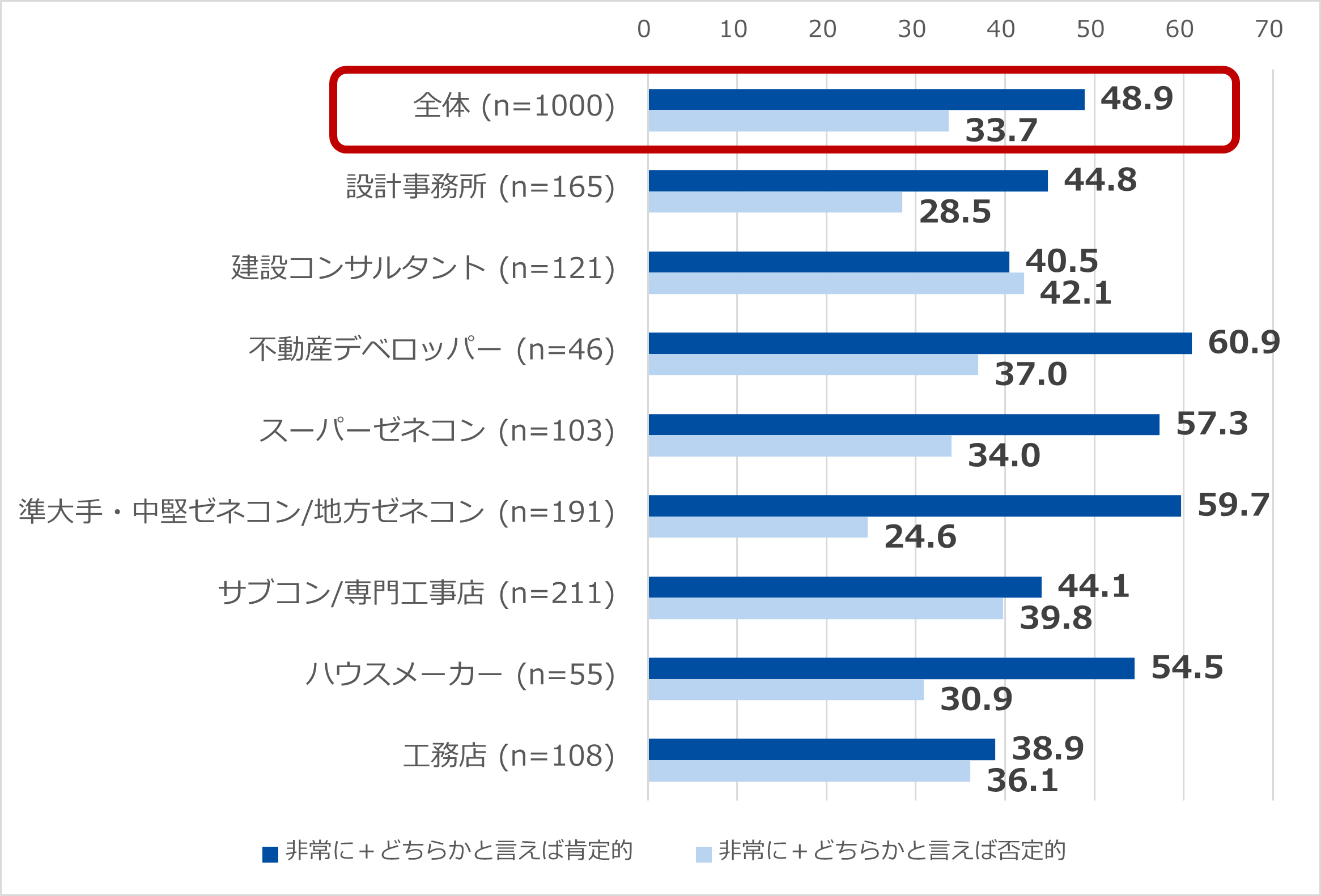 ●人手不足解消の一手となる「外国人従業員の受け入れ」の肯定・否定を聞いたところ、全体では「肯定的(48.9%)」「否定的(33.7%)」と、外国人の受け入れに肯定的な声が上回る。しかし、「事業所における外国人在籍率」別に掛け合わせ集計すると、「外国人従業員がいる事業所」では、受け入れに肯定的60.4%、否定的32.4%であるのに対して、「外国人従業員がいない事業所」では、肯定的30.4%、否定的43.9%と数字が逆転する。単純な人手の充足だけでなく、BuildApp など現場の生産性を上げるDX サービスなどとセットで、経験の少ない従業員でも質を維持した施工が可能となる現場改善が求められているとも考えられる。