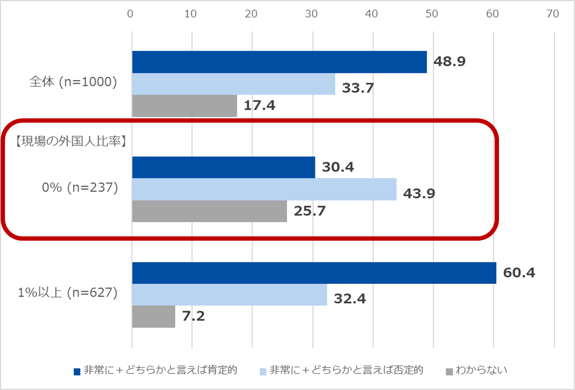 建設業界の人手不足解消策として注目される「外国人労働者の受け入れ」について、調査では全体で肯定的48.9%、否定的33.7%と、肯定派が優勢でした。しかし、「外国人従業員の在籍有無」と掛け合わせると、外国人従業員がいない事業所では否定的が高い数値となっています。
