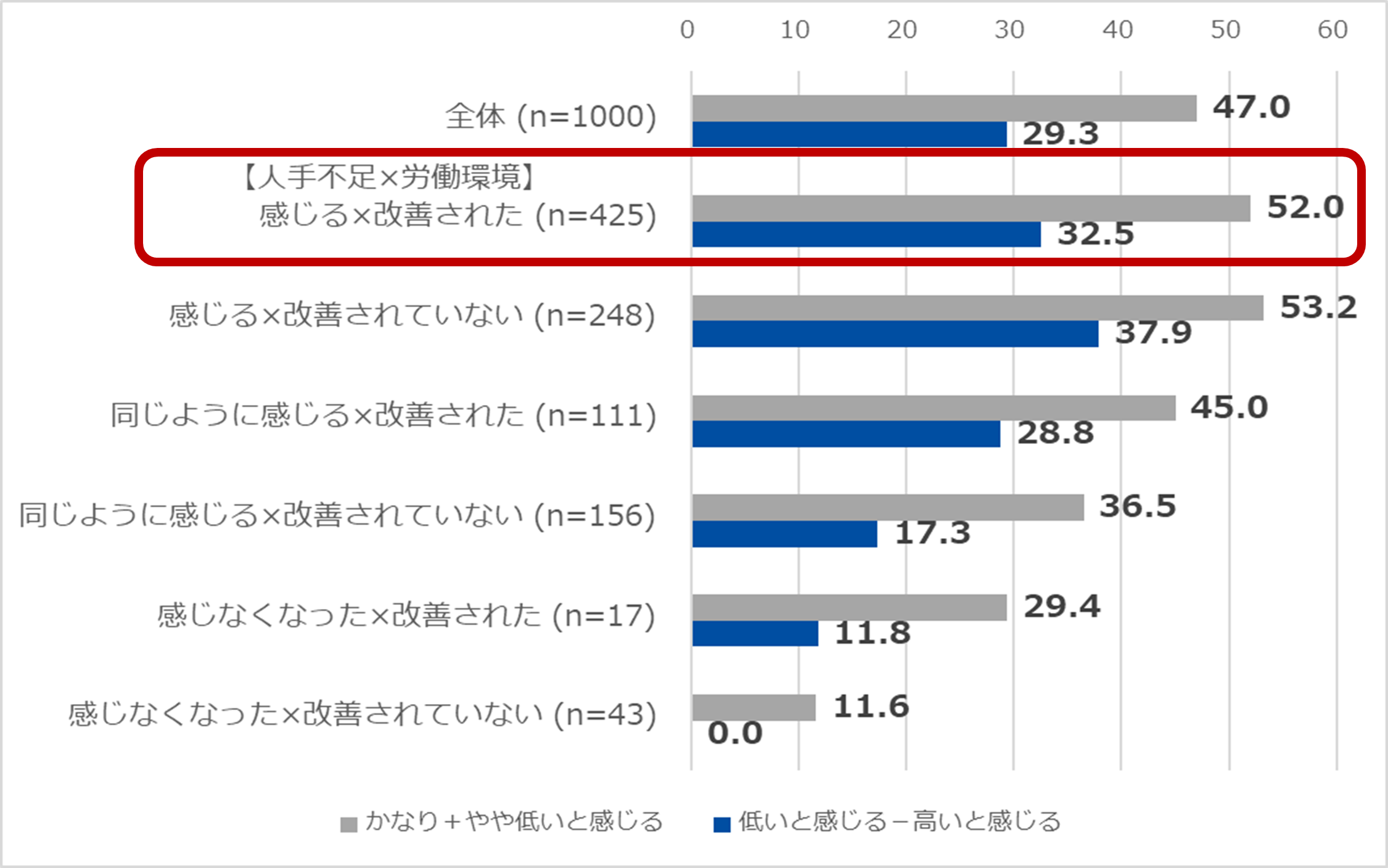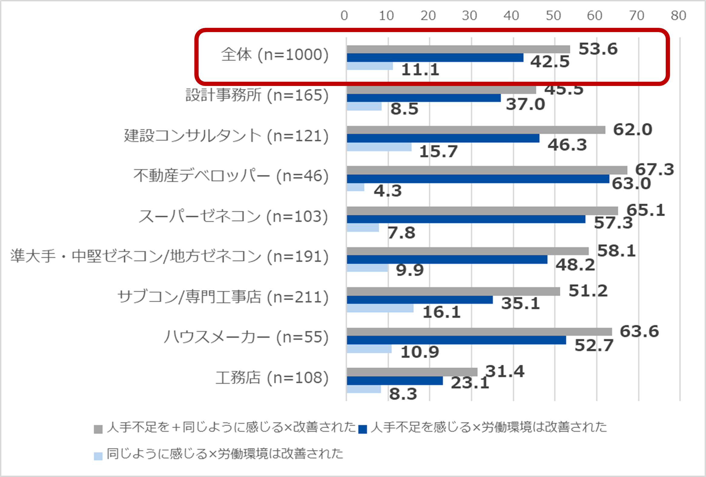 「人手不足を感じる×環境改善された」の裏には、人手は足りていないものの長時間労働を強いることもできないなかでいかに現場を回していくべきか、という現場関係者の苦悩がにじむ。
