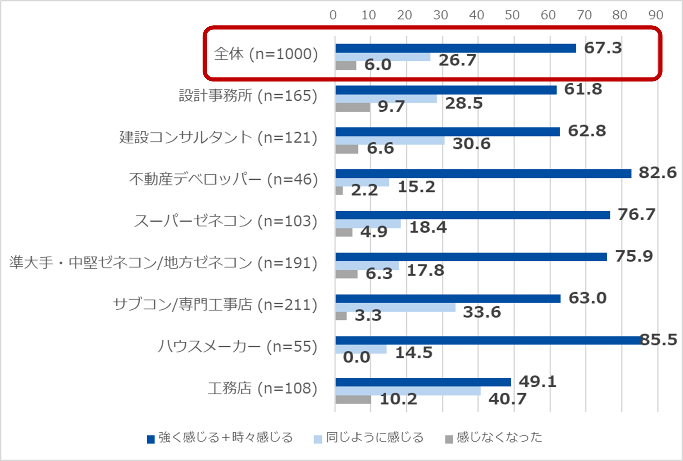 中でも「スーパーゼネコン(76.7%)」「準大手・中堅ゼネコン/地方ゼネコン(75.9%)」「サブコン/専門工事店(63.0%)」と現場に近い業種ではより深刻化している。
