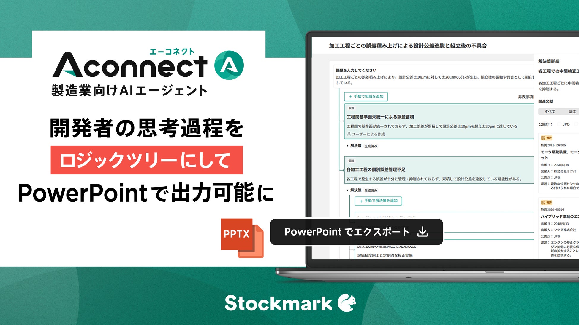 今回の新機能搭載により、『Aconnect』の技術探索エージェントが論文やニュースから生成した「解決策のアイデア」や「ロジックツリー」をワンクリックで、PowerPoint形式で出力することが可能になりました。