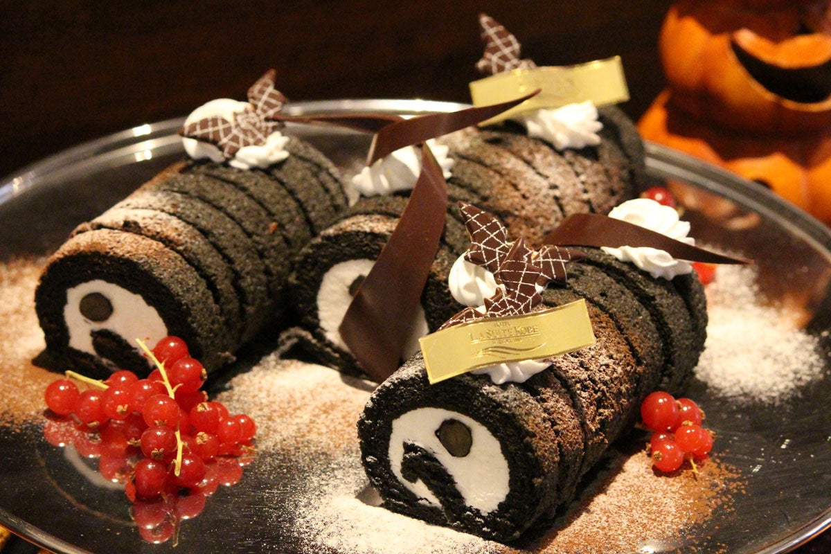 「ジャックオーランタンのとろけるパンプキンプリン」や「ミイラ風キャラメルポワールのムース」「魔女の帽子から出てきた紅はるかのスイートポテト」「コウモリの黒豆ブラックロール」など、ネーミングにもこだわったスイーツの数々は、姉妹施設「ル・パン神戸北野」のパティシエが腕によりをかけて作る自慢の品ばかりです。