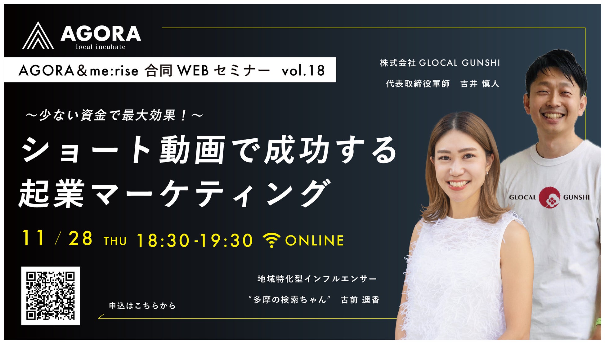 株式会社AGORAでは、2024年11月28日(木)に「ショート動画を活用したマーケティング」をテーマにした創業WEBセミナーを開催します。
