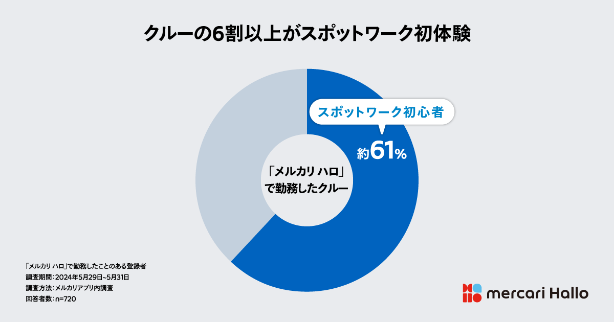 メルカリがクルーを対象にアンケートを実施した結果、「メルカリ ハロ」を通じて勤務したクルーの約61%がはじめてスポットワークを利用した「スポットワーク初心者」であることがわかりました。これまでスポットワークを経験したことがなかったお客さまも、慣れ親しんだ「メルカリ」を通じて、気軽にお仕事がはじめられています。