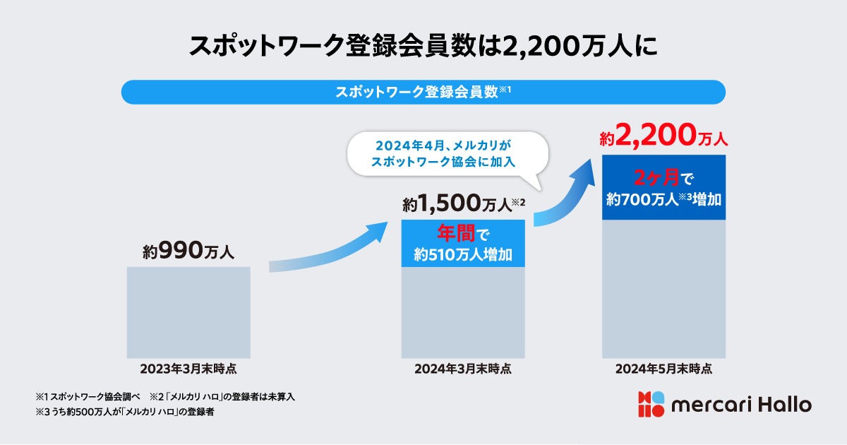 メルカリは、2024年3月6日より「だれでも、すぐに、かんたんに」働ける、空き時間おしごとサービス「メルカリ ハロ」の提供を1都3県で開始しました。その後、同年4月16日より全国展開を開始(※3)し、5月末には登録者数が500万人を突破いたしました。