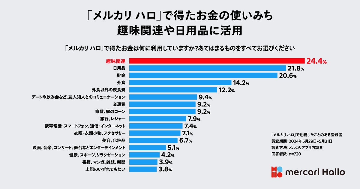 クルーに「メルカリ ハロ」を通じて得たお金の使いみちを聞いたところ1位「趣味関連(24.4%)」、2位「日用品(21.8%)」、3位「貯金(20.6%)」、4位「外食(14.2%)」の順となりました。日常生活でのお買いものに活用しているほか、スポットワークで得たお金を趣味をはじめとした「自身の好きなことやもの」に使っている利用者が多い傾向が伺えます。