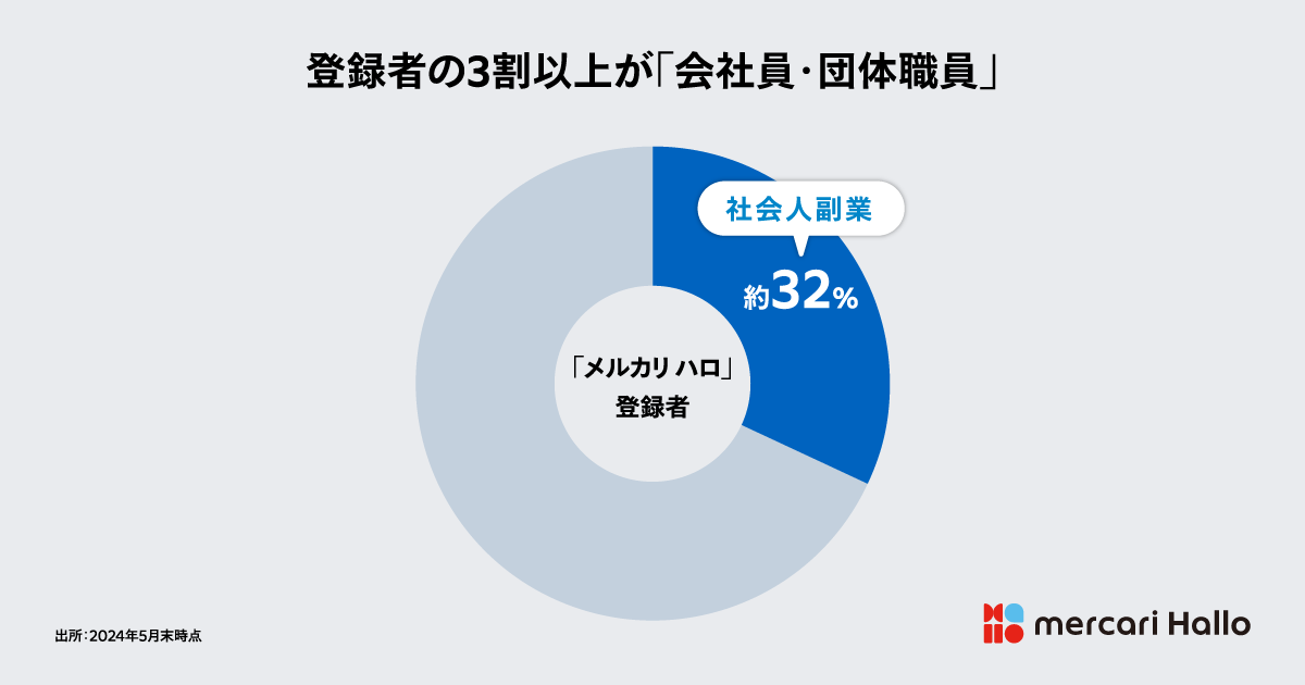 「メルカリ ハロ」は従来のアルバイト従事者や学生の方だけではなく、「社会人副業」にも活用いただいています。登録者の3人に1人以上(約32%)が会社員・団体職員であり、高まる副収入ニーズの受け皿にもなっています。