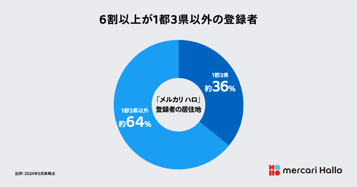 1都3県からサービス提供を開始した「メルカリ ハロ」ですが、4月16日より開始した全国展開にともない登録者が全国に広がっています。5月末時点で約64%が1都3県以外の登録者となっています。