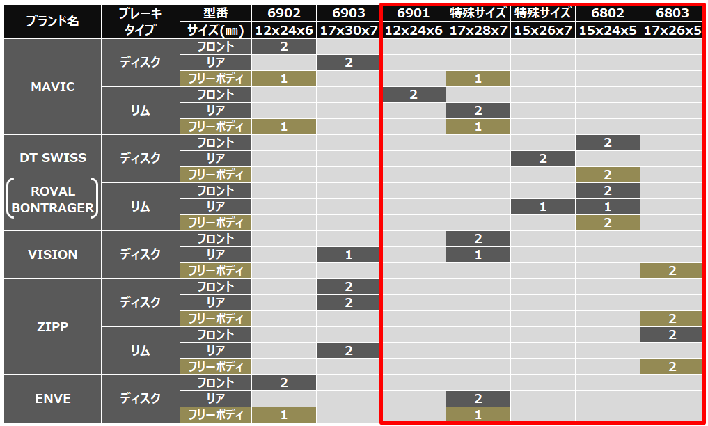 Mavicのディスクホイールのみならずリムホイールへの適合をはじめ、DT-swiss、Roval、Bontrager、Vision、ZIPP、ENVE各ブランドのホイールにも適合する型式をご提供していきます。さらには、フリーボディにも適合するONI BEARINGもご用意いたします。
