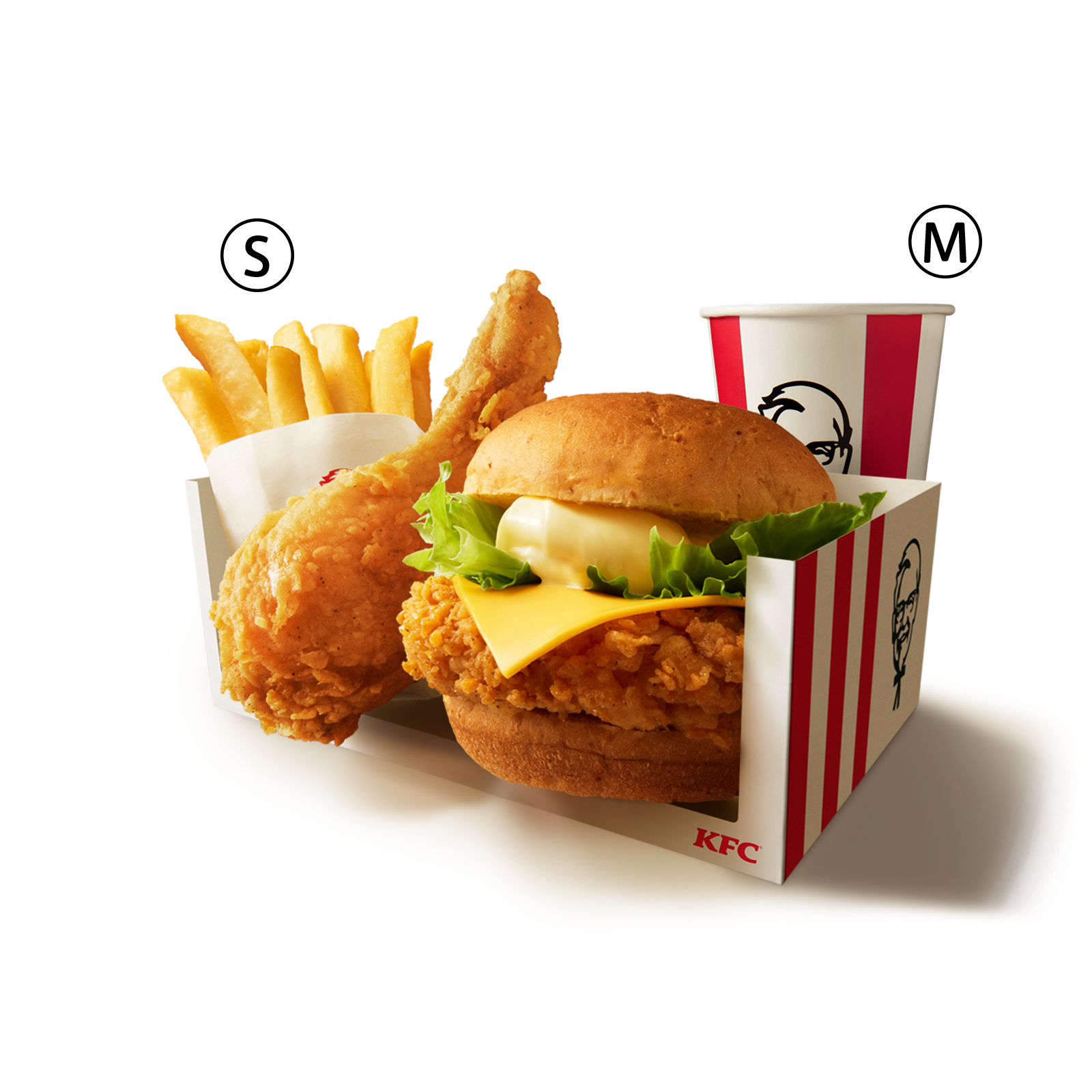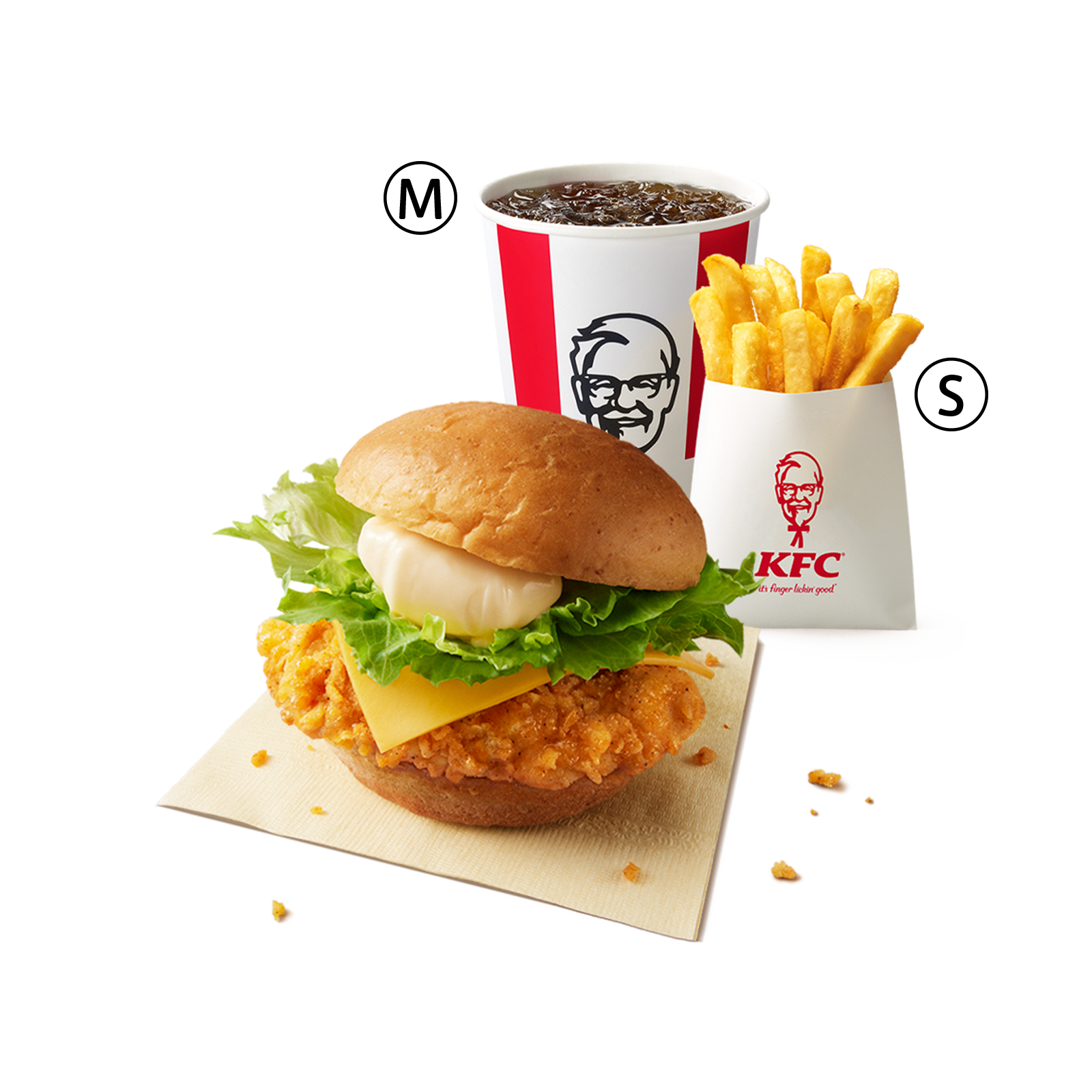 〔チーズチキンフィレバーガー、オリジナルチキン、ポテト(S)、ドリンク(M)〕