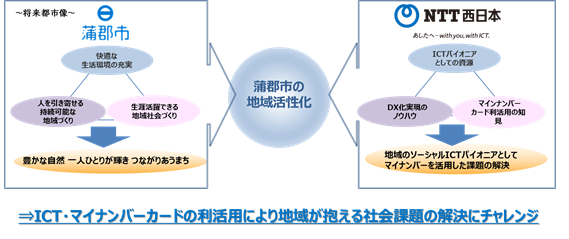 本協定は、第五次 蒲郡市総合計画の「まちづくり戦略」に示す、①快適な生活環境の充実、②生涯活躍できる地域社会づくり、③人を引き寄せる持続可能な地域づくりの実現に向け、NTT西日本が有するICT・マイナンバーカード利活用の知見及び資源等を活用し、地域課題の解決や地域経済の発展につなげていくことを目的としております。