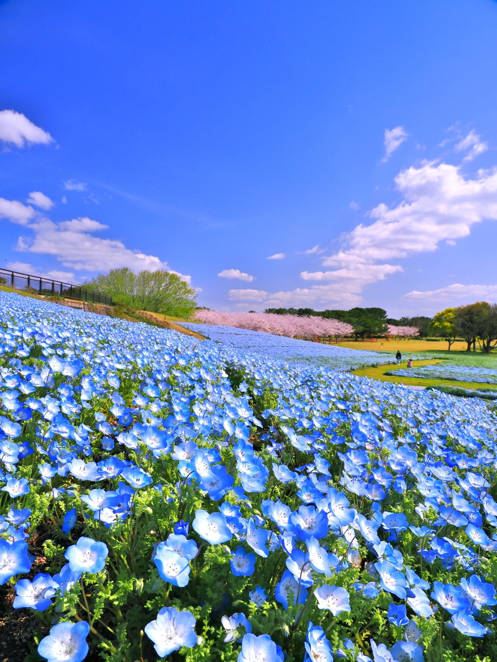 花の丘のネモフィラは一番人気のスポットです。丘一面を瑠璃色に染める花の海が広がります。4月上旬の数日間は、隣り合う桜のピンクと調和する光景が見られるかもしれません。
