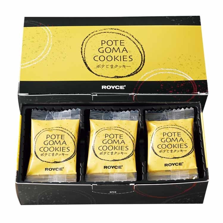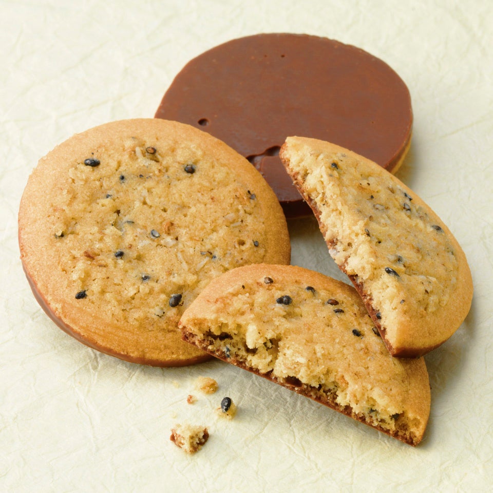 ポテトとごまを入れて焼き上げたサクサク香ばしいクッキーの片面に、まろやかで口どけの良いチョコレートをコーティングしました。ザクッとした歯ざわりとほんのり効いた塩味がアクセント。軽やかな食感とともにポテトとごまの香ばしい風味が豊かに広がります。