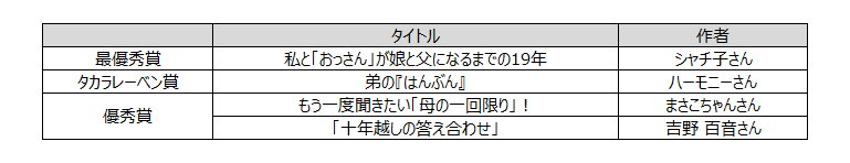 当社は、第2回となった4年前より特別協賛をさせていただいており、全応募作品の中から特に「幸せ」が感じられる作品を「タカラレーベン賞」として選出しております。