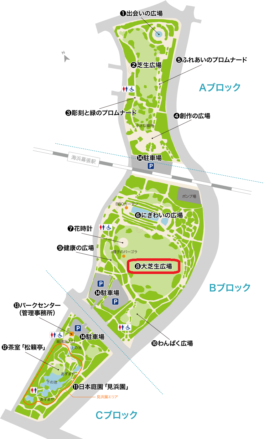 『県立幕張海浜公園みどりと海パートナーズ』は、公園全体のうちA・B・Cブロックの管理・運営を行っています。主な施設として、日本庭園、茶室、大芝生広場、花時計、わんぱく広場、彫刻と緑のプロムナード、にぎわいの広場、創作の広場があります。中でも、日本庭園の「見浜園」や、日本文化の象徴である茶室「松籟亭」は、国際的な文化交流スペースとしても活用されています。