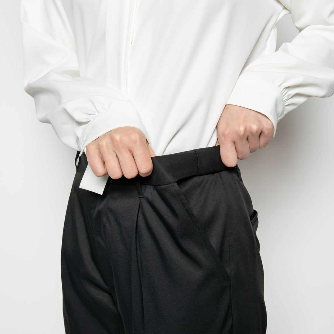 授業参観や面談でも使えて、固い印象になりすぎないノーカラージャケットは、黒板を書く際や肩周りの大きな動作も快適にできるようゆとりのあるサイズにし、背中が見えにくく、お尻もしっかり隠れる丈感にしました。ジャケット内側はポケット2つ、ペン挿しとセンセイカプセルのピスネームを配置。パンツはゴムを両サイドに内蔵することで、腰回りのもたつきが一切なくなり、タックを入れることでよりスタイリッシュに仕上げました。