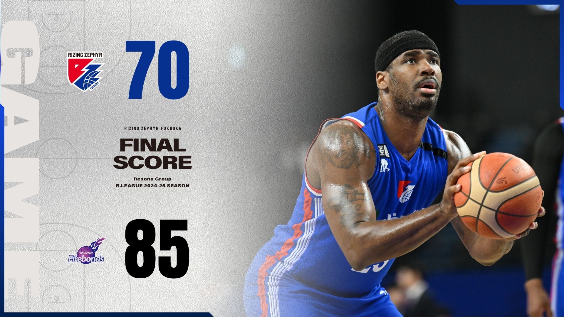 2025 年1月24日(金)に開催されました、りそなグループ B.LEAGUE 2024-25 シーズン第 18 節【ライジングゼファーフクオカvs.福島ファイヤーボンズ】の結果は、 “福岡70-85福島”で福岡の勝利となりましたことを、お知らせいたします。