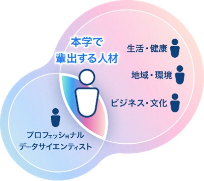 生活・健康、地域・環境、ビジネス・文化の領域から学生各自が主体的に社会課題を把握、数理科学・統計学・情報学を基盤とするデータサイエンス・AIの専門知識・技術、並びに社会課題解決におけるその活用法を修得し、社会課題に対して仮説を立て、検証にデータを利活用し、データサイエンスの視点でステークホルダーとコミュニケーションをとり、解決策を示すことができる人材を養成していきます。