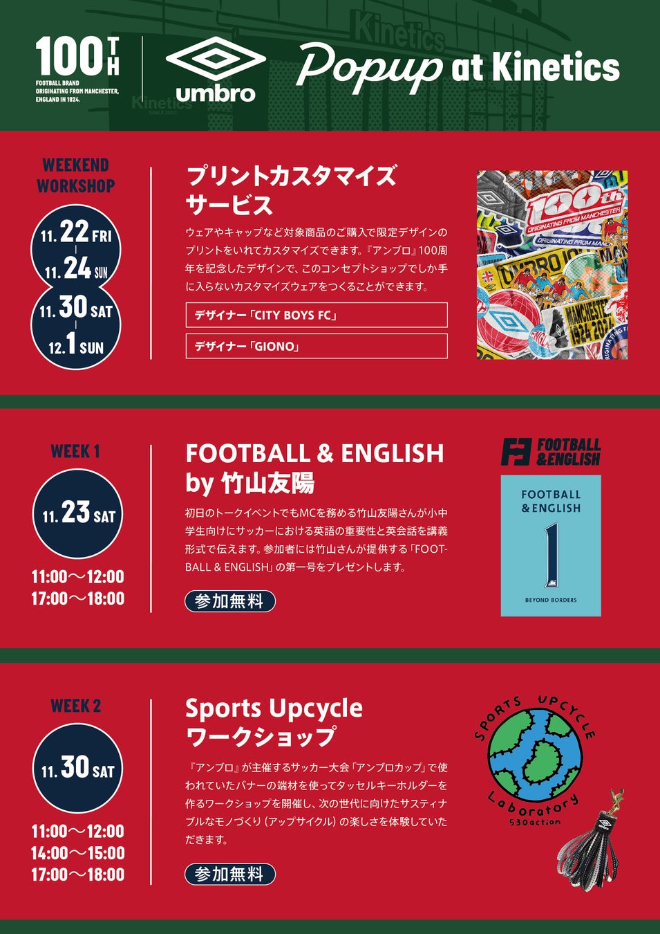 そして今回、100周年のフィナーレとして開催する本ポップアップイベントでは、『アンブロ』の今シーズンの新作や、海外の新進気鋭ブランドとのコラボアイテム、サッカーセレクトショップ「BENE」厳選のヴィンテージ・ユニフォームなど、サッカー好きにはたまらない商品展開に加え、イベントも企画しています。スペシャルゲストによるトークショーや音楽イベント、また、子どもから大人まで楽しめるワークショップも複数開催します。(一部事前申し込みが必要です。)