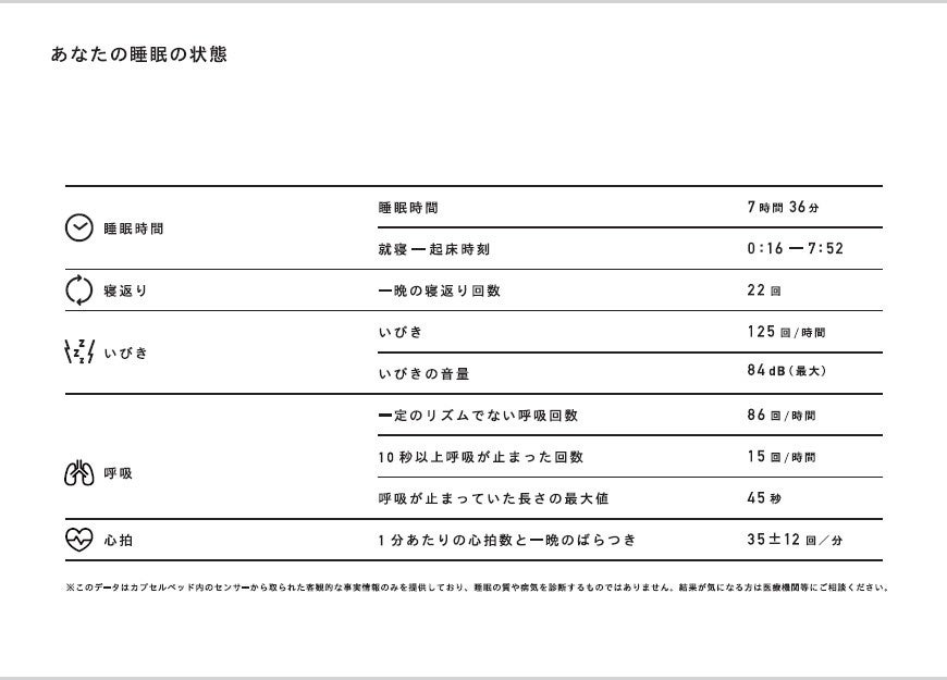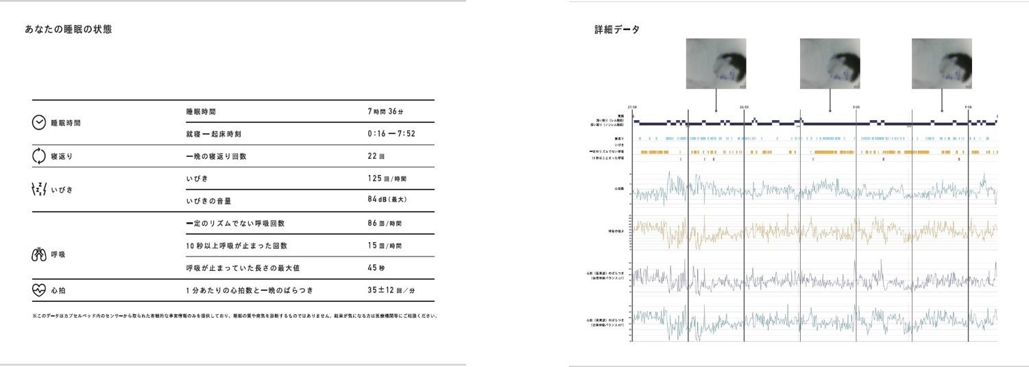 ナインアワーズが2021年12月より一部店舗において、開始した「9h sleep fitscan」というサービスです。カプセルベッド内に設置された赤外線カメラ・収音マイク・体動センサーにて測定した心拍数やいびき、無呼吸になった回数・時間などのデータの提供を宿泊料金以外の追加料金がかからず、気軽に利用できます。