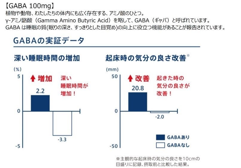 本品にはGABAが含まれます。GABAは睡眠の質 (眠りの深さ、すっきりとした目覚め)の向上に役立つ機能や、仕事や勉強などによる一時的な疲労感や精神的ストレスを緩和する機能があることが報告されています。