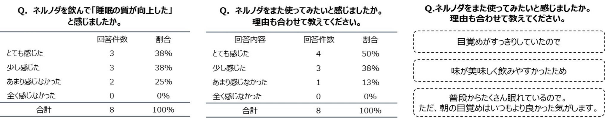 お客様からは“目覚めがすっきりした”、“味が美味しくて飲みやすかった”など嬉しいお言葉を頂きました。また“普段たくさん眠れているため自分には必要は無いが、目覚めは良かった”などのお声も頂いております。多くのお客様に「睡眠の質が向上した」、ネルノダをまた使ってみたいと感じて頂くことができました。