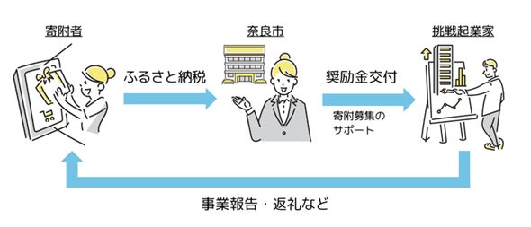 本事業は、対象となる起業家を公募により選定し、選定された起業家の事業計画をふるさと納税ポータルサイトに掲載し、事業に共感する方々から資金を募ります。集まった寄附金は全額、起業家の方へ奨励金として交付されます。(市のふるさと納税返礼品を活用した場合は、返礼品額に相当する3割を差し引いた金額を交付します。)交付された奨励金は、事業の広告費や材料費、導入いただく設備の資金の一部に充てるなど、起業家の方が自由な用途で使うことができます。