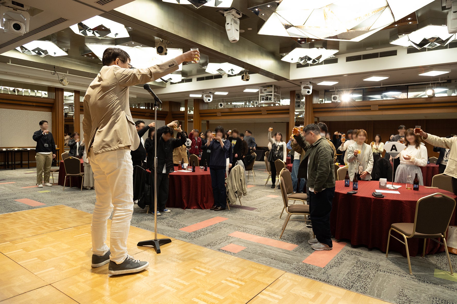 入社式から2日後の4月3日、コートヤード・マリオットホテル銀座東武ホテルにて、約70名が参加する全社懇親会を開催しました。