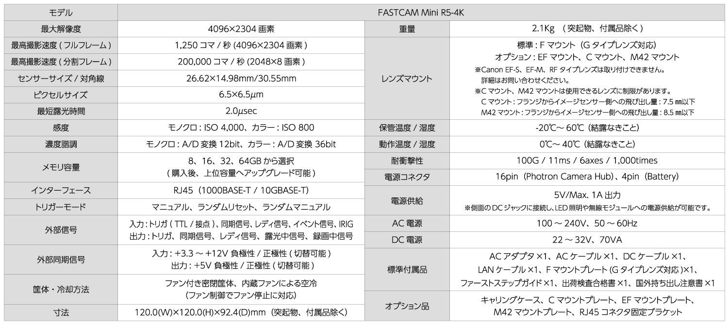 『FASTCAM Mini R5-4K』は4K解像度(4096×2304画素)で1,250コマ/秒、Full HD解像度(1920×1080画素)で5,280コマ/秒、最高撮影速度は20万コマ/秒の撮影が可能です。