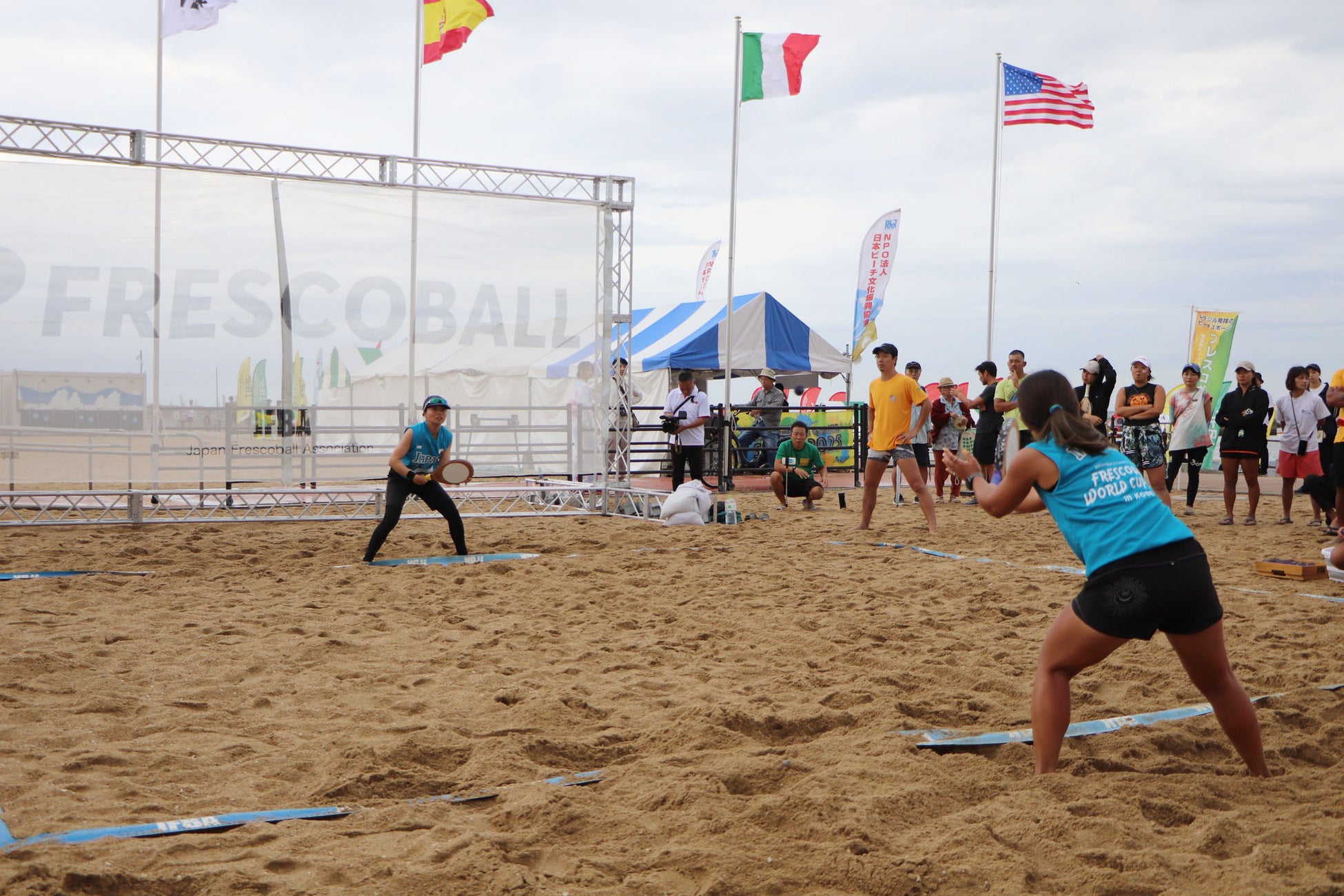 フレスコボールは、ブラジルのリオデジャネイロ発祥のビーチスポーツです。1945年にリオ・デ・ジャネイロのコパカバーナビーチで考案され、現在は世界各地のビーチで親しまれるようになっています。フレスコボールの最大の特徴は、向かい合う2人が競い合うのではなく、協力してラリーを続ける採点競技という点。競技時間は5分間、7mの距離を保って試合を行います。協力してラリーを続ける様子から「思いやりのスポーツ」とも言われています。JFBAでは、国際的なルール統一に向けてリオフレスコボール連盟(FEFERJ)と世界初の国際組織『UAFI』設立に向けて2025年10月に基本合意。世界のフレスコボール界を一つにする動きを進めています。