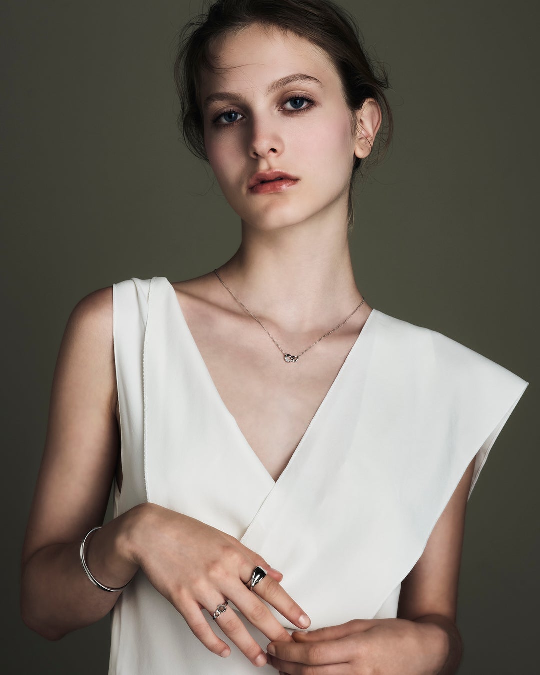 直線的に立ち並ぶビル群からイメージしたネックレスや、地金と硬質なダイヤモンドの輝きのコントラストが美しいネックレス。無駄を削ぎ落としたシャープなデザインが都会的で洗練された大人の表情を演出します。