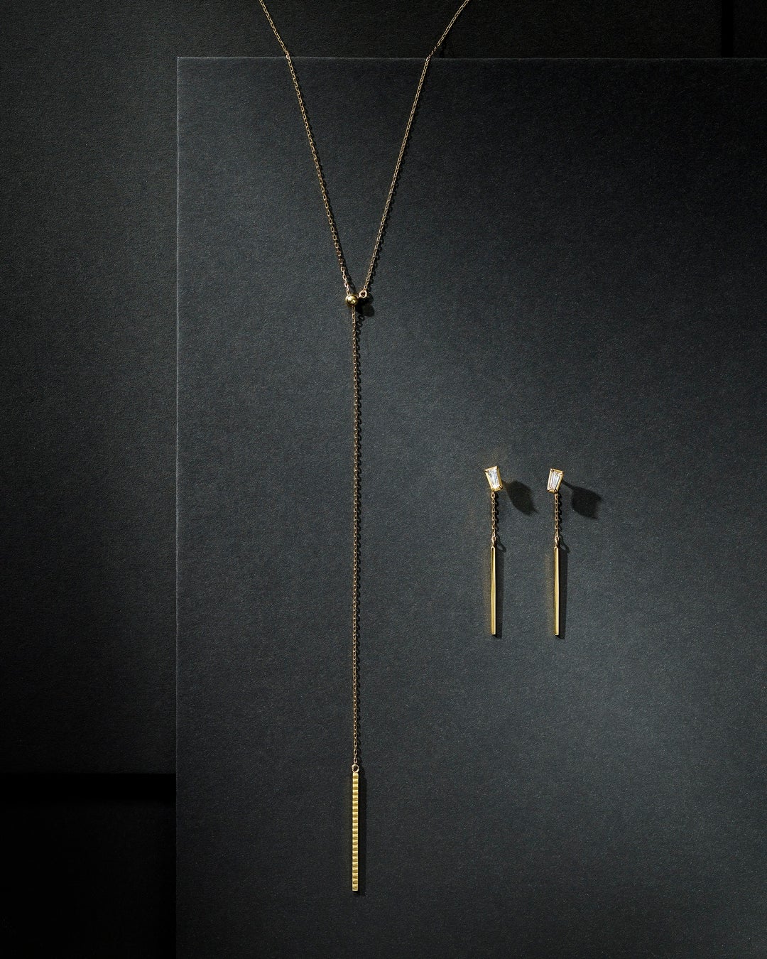 ソリッドなバーが揺れるモダンなネックレスとピアス。トップの長さを自由に調節できるネックレスは、チョーカーのように着けても長めにゆったりと着けても。いつものコーディネートにさらりと身に着けるだけで、輝きが際立ちこなれた印象に。テーパーバゲットカットのキュービックジルコニアがきらめくピアスは、チャームを外してシンプルなスタッドピアスとしても着用可能。すっきりとした縦のラインが横顔をシャープに見せてくれます。